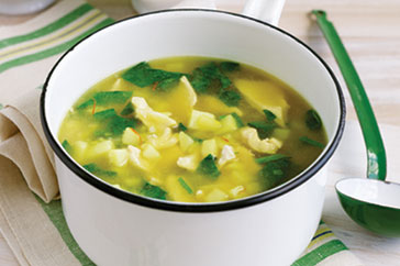 - Add the chicken and spinach to the soup and cook, stirring, for 2 minutes or until the chicken is just cooked through. Taste and season with pepper.